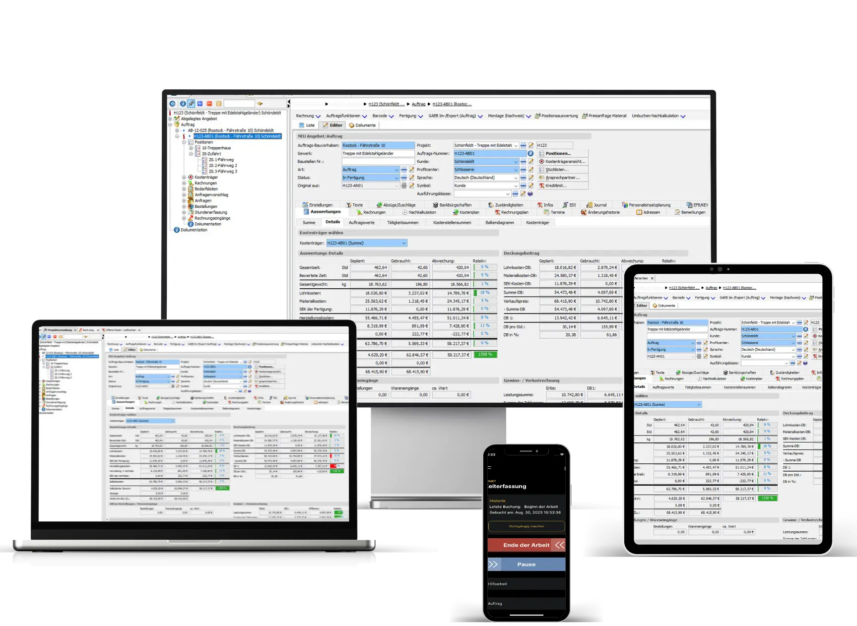 sowie der responsiven Benutzeroberfläche bleiben Sie jederzeit handlungsfähig. Erfassen Sie Zeiten, scannen Dokumente, prüfen Auftragsdetails oder greifen Sie auf wichtige Kunden- und Projektdaten zu – sicher, schnell und ortsunabhängig